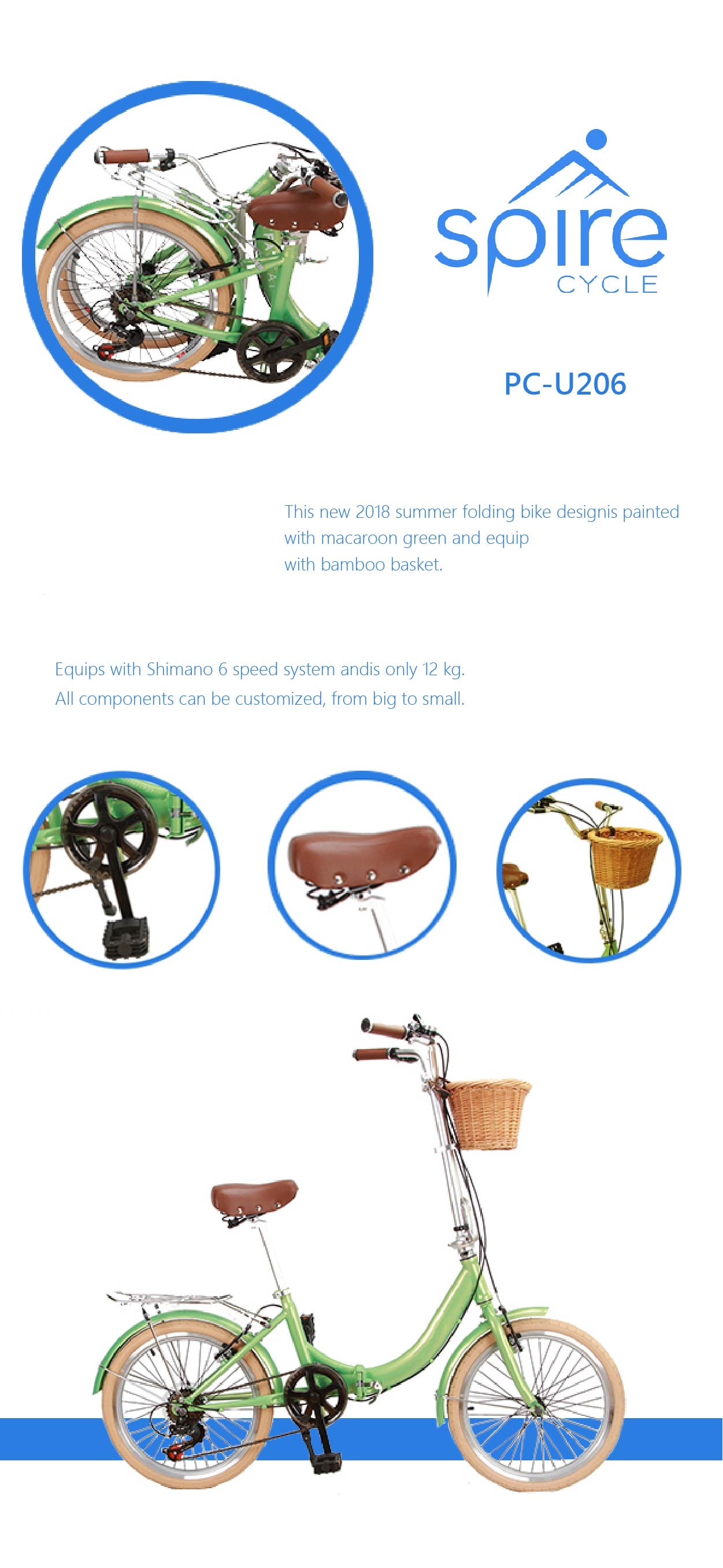 Dieses neue Sommer-Faltraddesign für 2018 ist makronengrün lackiert und mit einem Bambuskorb ausgestattet. Ausgestattet mit Shimano 6-Gang-System und ist nur 12 kg. Alle Komponenten können von groß bis klein angepasst werden. Von der Rahmen- und Gabelfarbe über das Geschwindigkeitssystem, das Reifenmuster bis zur Grifffarbe, den Satteldruck und die Kabelfarbe können die Anforderungen des Kunden angepasst werden. Es ist perfekt für den täglichen Pendelverkehr. Einfach auf und aus dem Bus zu tragen. Kommt bei Bedarf mit einer Fahrradtasche.