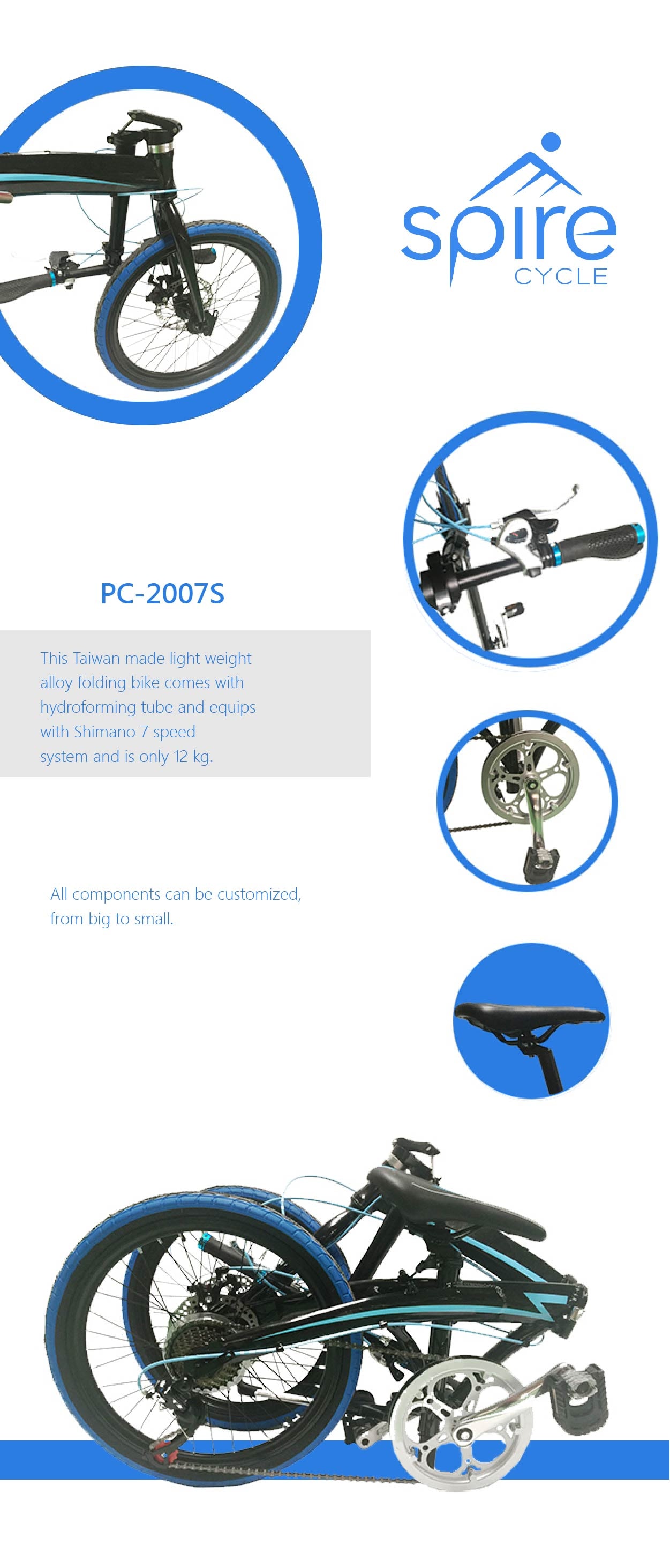 Dieses Leichtmetall-Faltrad aus Taiwan wird mit einem Hydroforming-Rohr geliefert, ist mit dem Shimano 7-Gang-System ausgestattet und wiegt nur 12 kg. Alle Komponenten können von groß bis klein angepasst werden. Von der Rahmen- und Gabelfarbe über das Geschwindigkeitssystem, das Reifenmuster bis zur Grifffarbe, den Satteldruck und die Kabelfarbe können die Anforderungen des Kunden angepasst werden. Es ist perfekt für den täglichen Pendelverkehr. Einfach auf und aus dem Bus zu tragen. Kommt bei Bedarf mit einer Fahrradtasche.